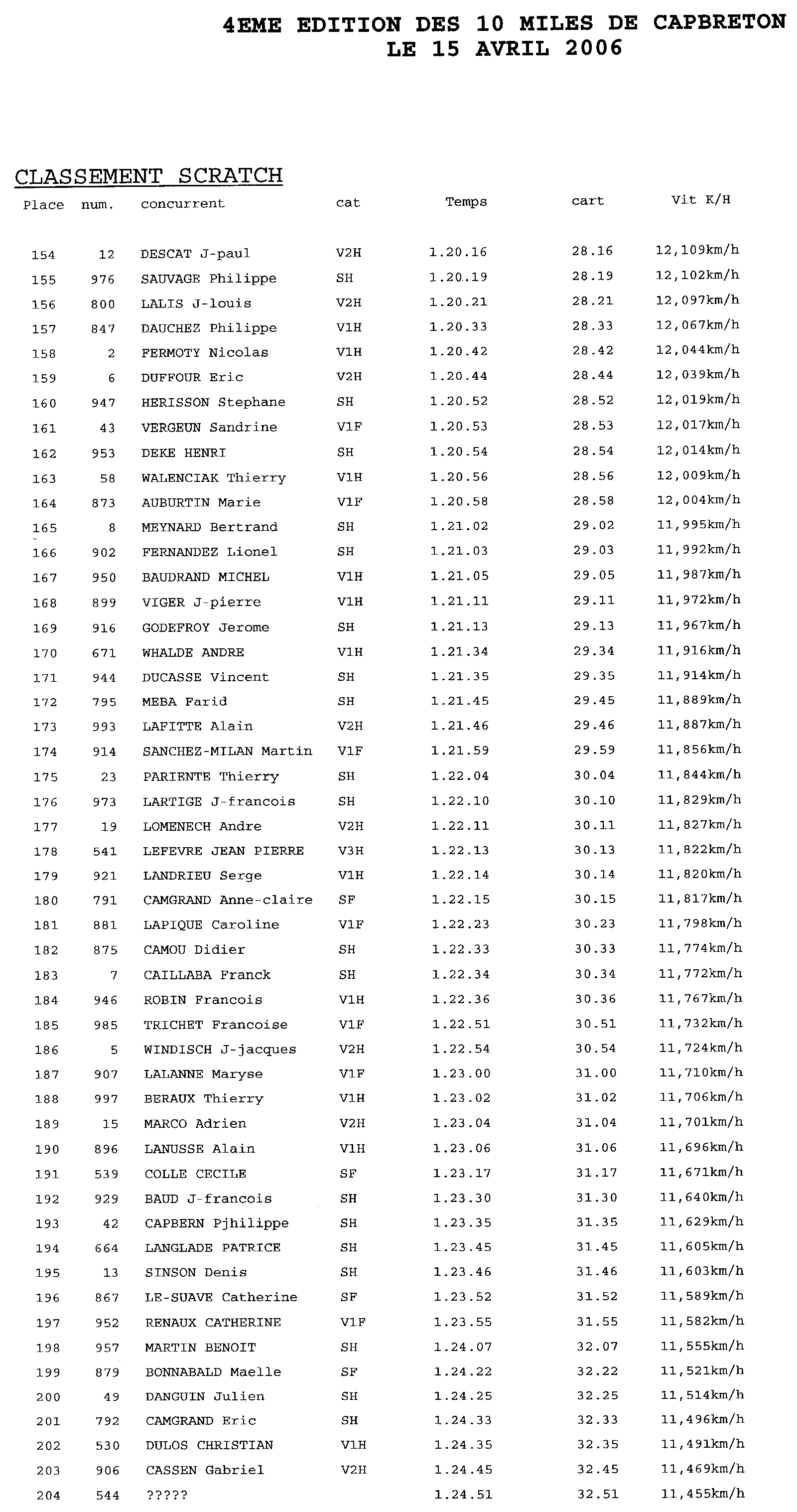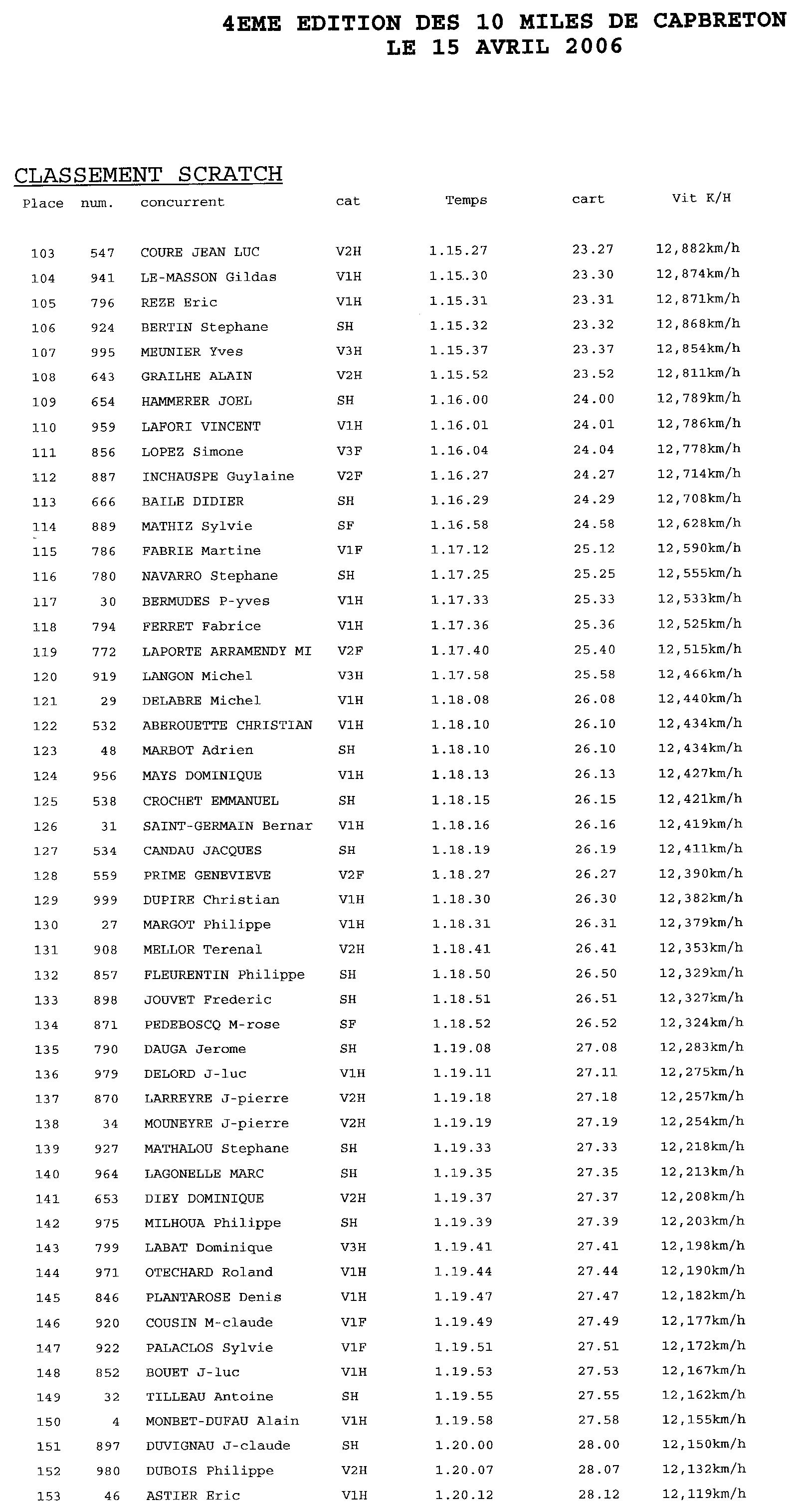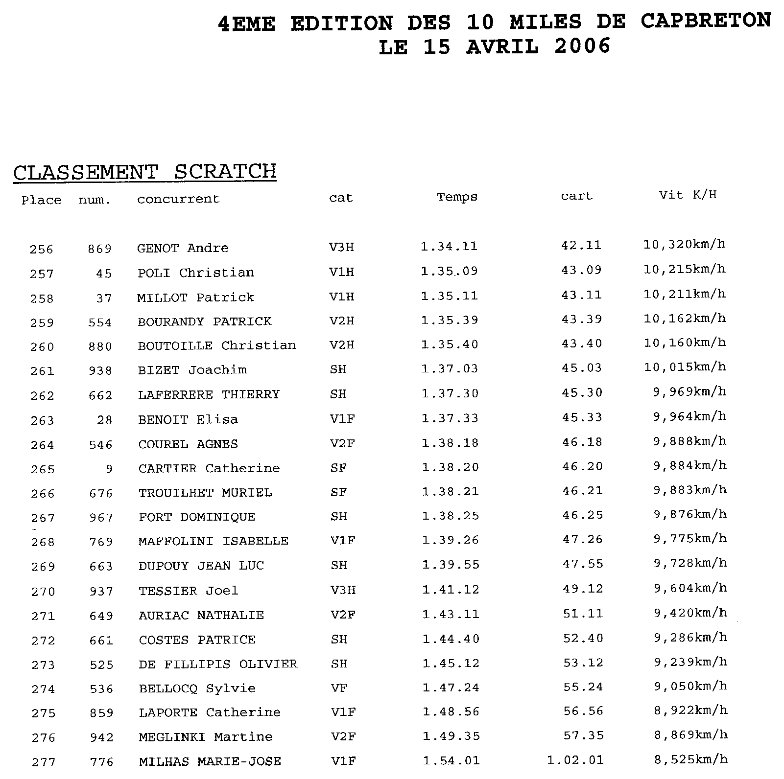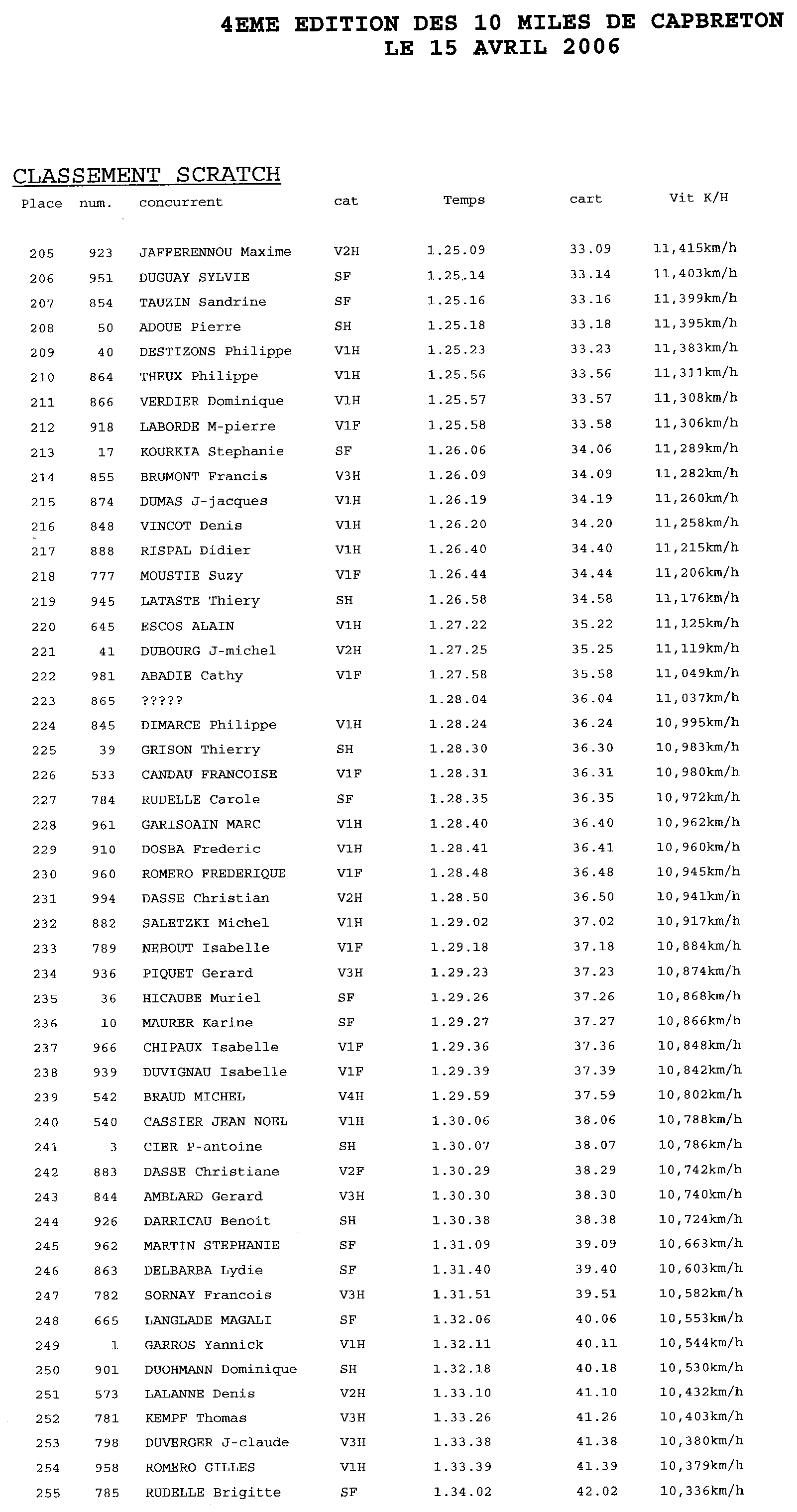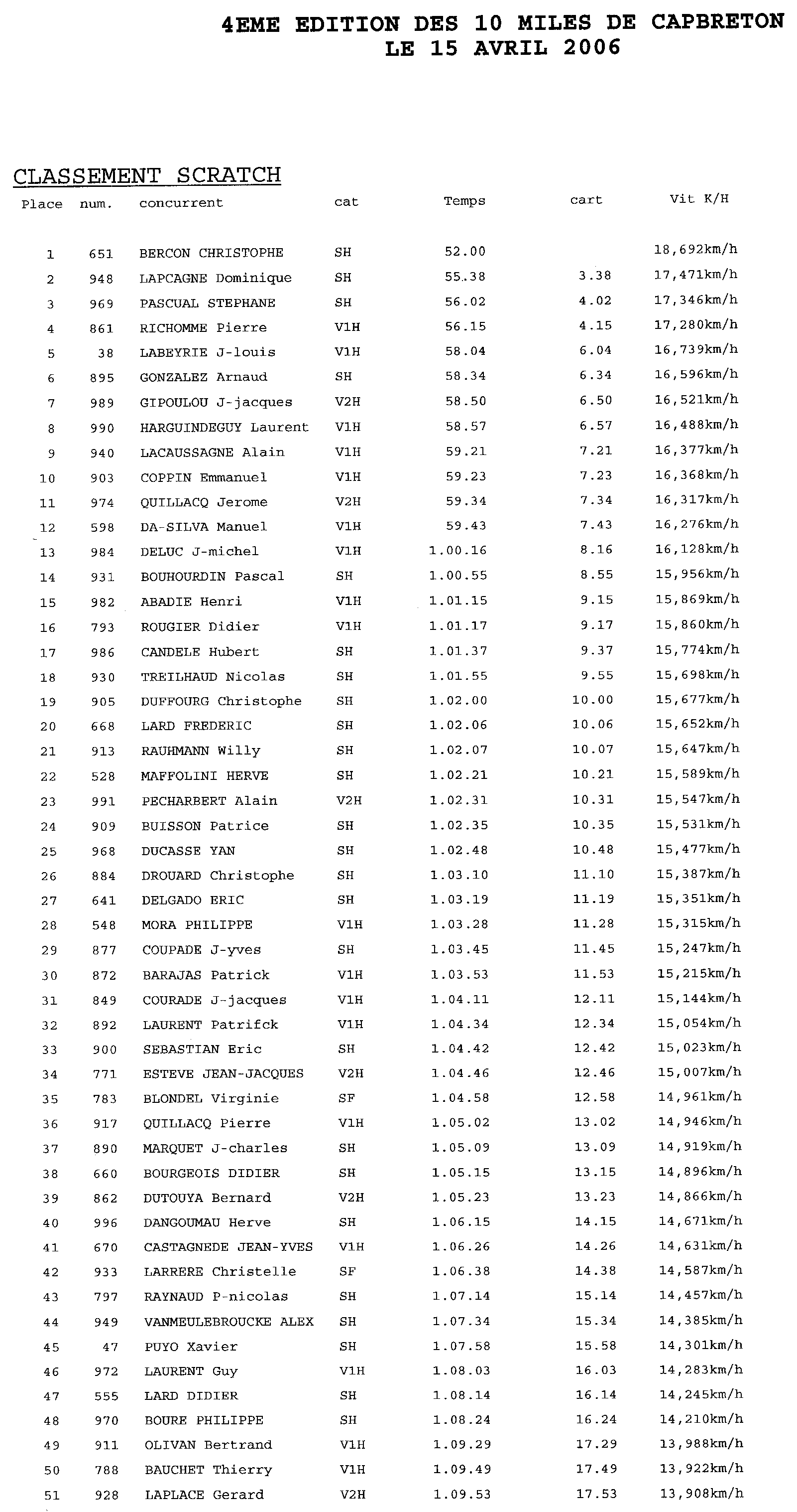Voici les résultats de la course pour l'année 2006